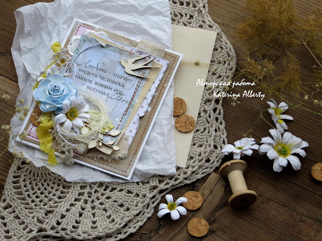 В итоге состряпала я простую деревенскую открыточку c ромашками.. о любви..и ласточках) Смотрим! Розочка у меня тоже самодельная)).. Чипборд использовала от магазинчика ScrapКрым